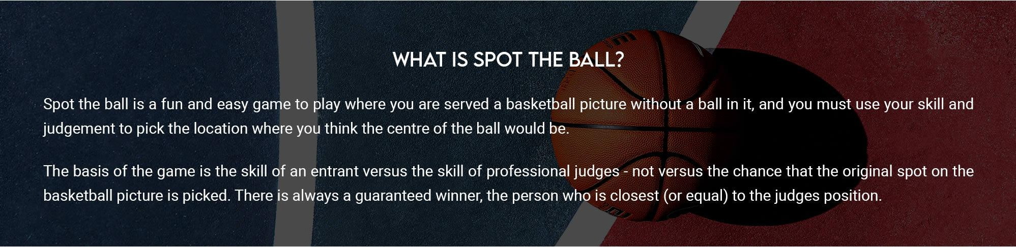 Spot the ball is a fun and easy game to play where you are served a basketball picture without a ball in it, and you must use your skills and judgement to pick the location where you think the center of the ball should be. The basis of the game is the skill of an entrant versus the skill of professional judges - not versus the chance that the original spot on the basketball picture is picked.