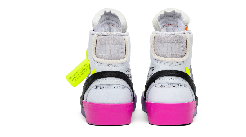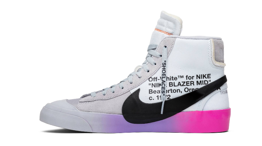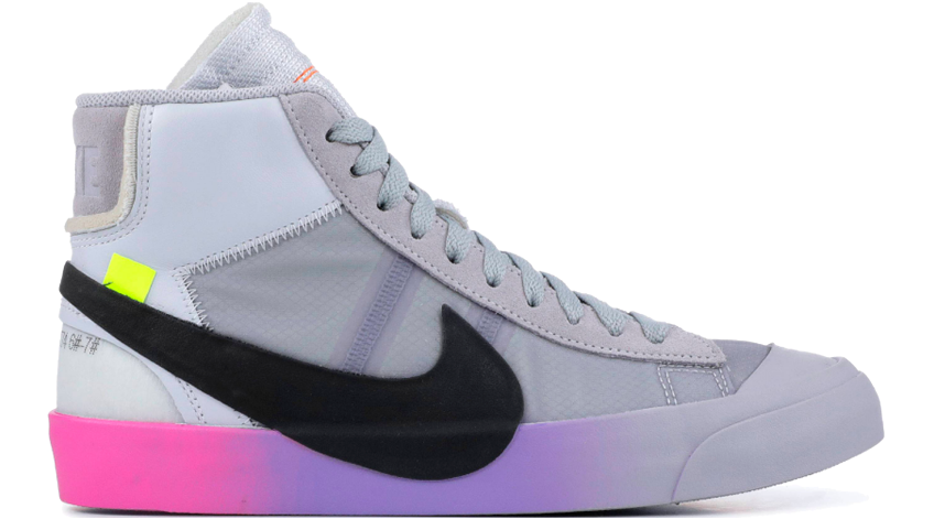 The Off-White x Blazer Studio Mid ‘Queen’ was designed by Virgil Abloh as part of a larger collection celebrating Serena Williams’ appearance at the 2018 U.S. Open. The shoe flaunts a fluorescent colorway with a wolf grey upper, black “Swoosh”, and a color gradient sole that goes from purple to platinum. Other eye-catching details include an oversized black Swoosh, and a rubber midsole featuring gradient coloring that transitions from pink to purple to grey. At last, the signature Off-White text on the side panel followed by the "QUEEN OF QUEENS, NY" phrase stamped on the volt zip-tie wraps up the whole design.